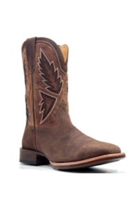 Pé fabricado em couro Bovino, na cor Dakar Café, bico quadrado, florão bordado no peito do pé.