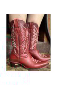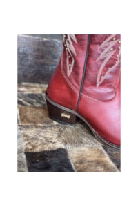 Pé fabricado em couro Bovino na cor Fossil Vermelho. Bico Fino, com bordados. Cano de aproximadamente 29cm, em couro bovino na cor Fossil Vermelho, com bordados e rebites. Forrada internamente em tecido e puxador nas laterais. Com Solado de Color Plac que é um material leve, resistente e antiderrapante presente nas melhores botas Western da atualidade. Uma costura nas laterais, Palmilha removível e puxadores de couro na lateral. Salto de aproximadamente 5cm Produto de excelente qualidade.