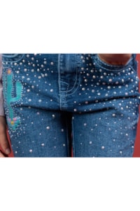 Calça Miss Country Infantil 1071 Confeccionada em tecido 98% Algodão, 2% Elastano, na cor Jeans, com bordados e aplique de strass . Modelagem ajustada ao corpo. MARCA: Miss Country PRODUTO: Calça  REFERÊNCIA: 1071 CONFECÇÃO: 98% Algodão, 2% Elastano