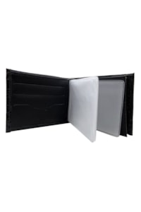 Fabricada em couro legítimo de Boi (imitação de crocodilo), na cor Preto. Possui porta cédulas com repartição, 6 porta documentos, 6 porta cartões. *Acompanha um chaveiro de couro.