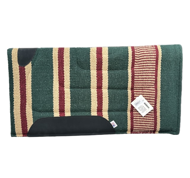 Manta Mustang importada para selas western, fabricada em feltro, revestimento em 100% Lã da Nova Zelândia com estampa navajo nas cores Verde, Bege e Bordô,  reforço em couro nas laterais, cernelha e parte interna em pelúcia. Esta manta fornece o ajuste essencial ao seu cavalo que necessita de um melhor conforto. Com uma distribuição uniforme da pressão sobre o dorso do animal. Fino acabamento.
