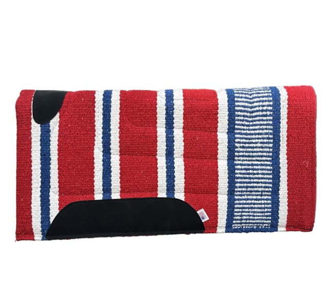 Manta Mustang importada para selas western, fabricada em feltro, revestimento em 100% Lã da Nova Zelândia com estampa navajo nas cores Vermelho, Branco e Azul,  reforço em couro nas laterais, cernelha e parte interna em pelúcia. Esta manta fornece o ajuste essencial ao seu cavalo que necessita de um melhor conforto. Com uma distribuição uniforme da pressão sobre o dorso do animal. Fino acabamento.
